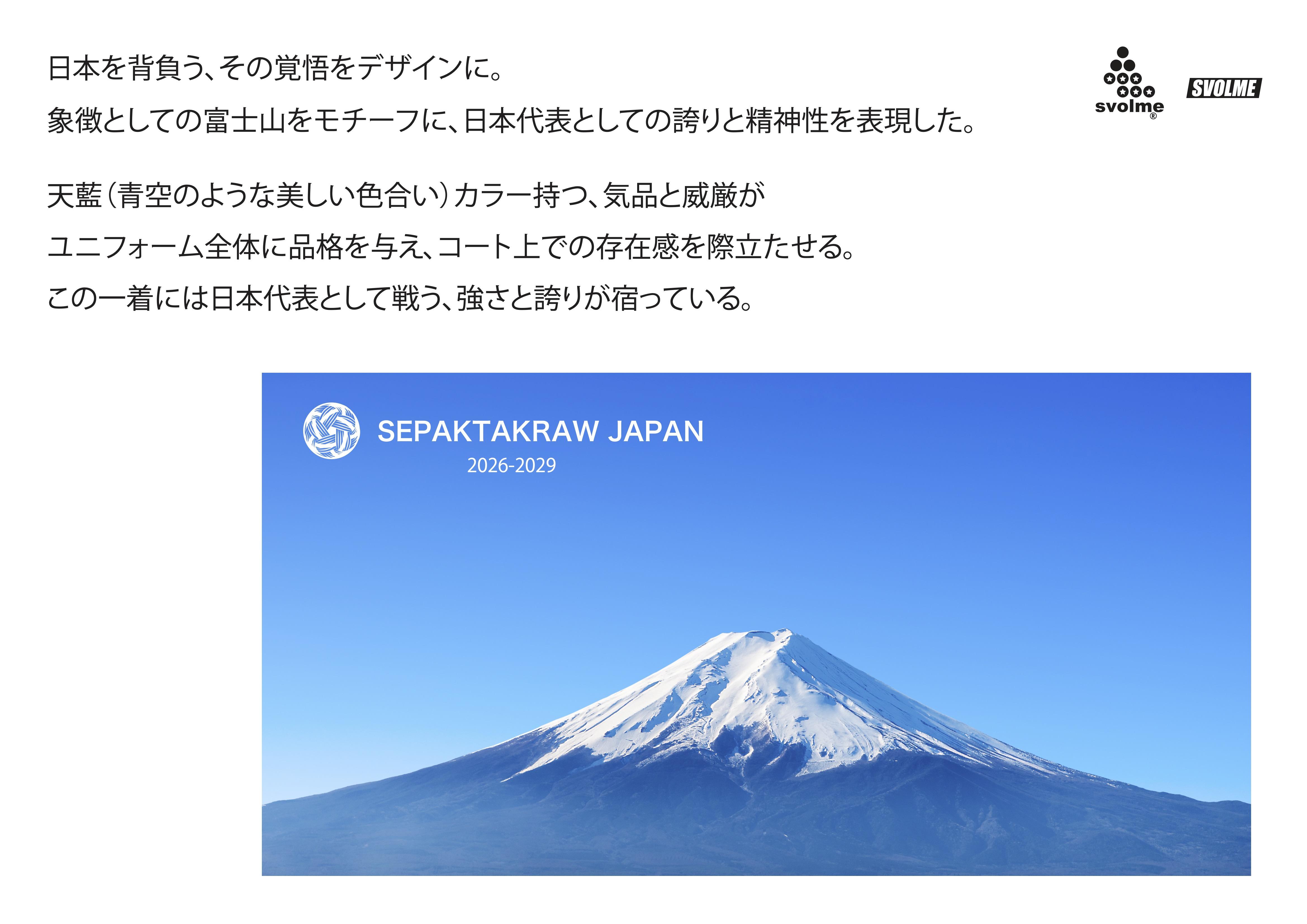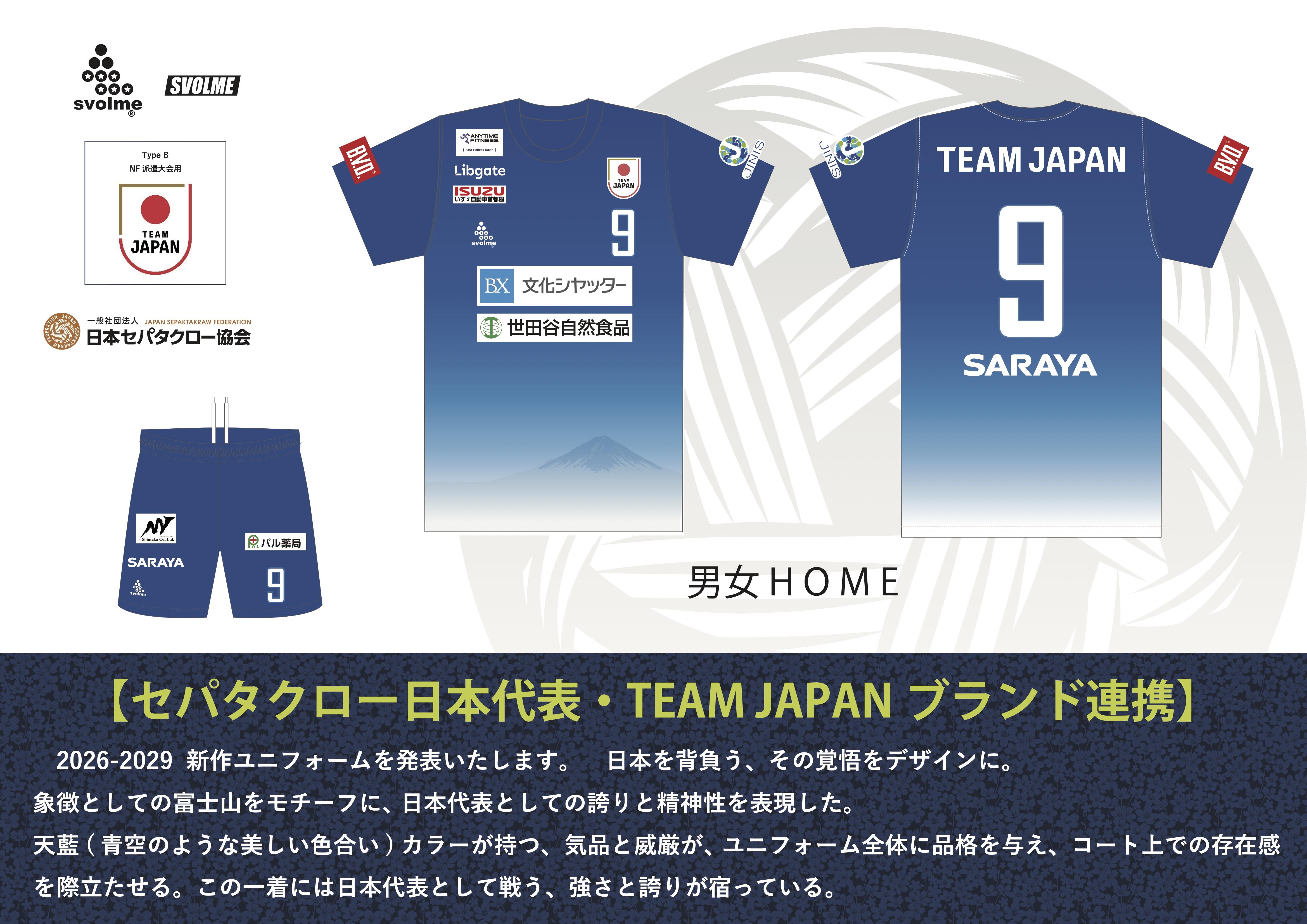 2026-2029 新作ユニフォーム・TEAM JAPANブランド連携発表 更新日:2026.04.01 【2026-2029 新作ユニフォーム・TEAM JAPANブランド連携発表】 TEAM JAPANブランド連携(Type B:NF派遣大会用 HOME) 日本を背負う、その覚悟をデザインに。 象徴としての富士山をモチーフに、日本代表としての誇りと精神性を表現。 天藍(青空のような美しい色合い)カラーが持つ、気品と威厳が、ユニフォーム全体に品格を与え、コート上での存在感を際立たせる。 この一着には日本代表として戦う、強さと誇りが宿っている。